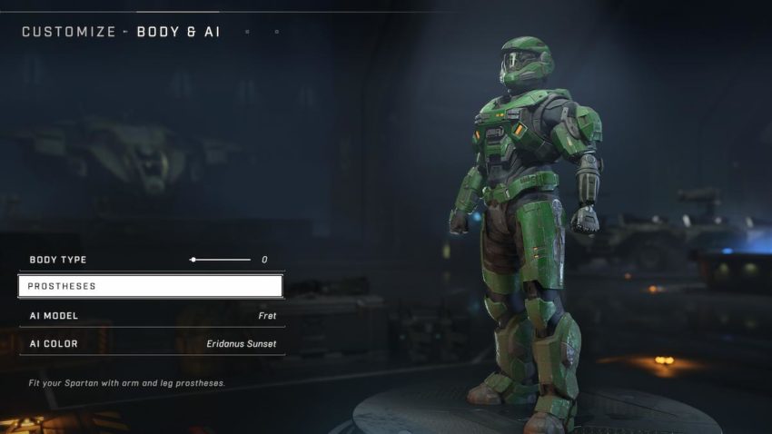 To tweak your soldier a little more, back out to the customization menu and select “Body & AI.” Here, you’ll be able to choose your Spartan’s body type; you can give them a bulky, slender, or mid-sized frame. In this menu, you’ll also be able to apply prosthetic limbs to your Spartan, as well as change their suit’s AI companion.