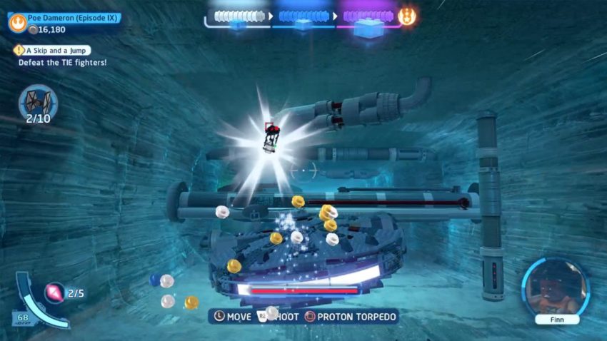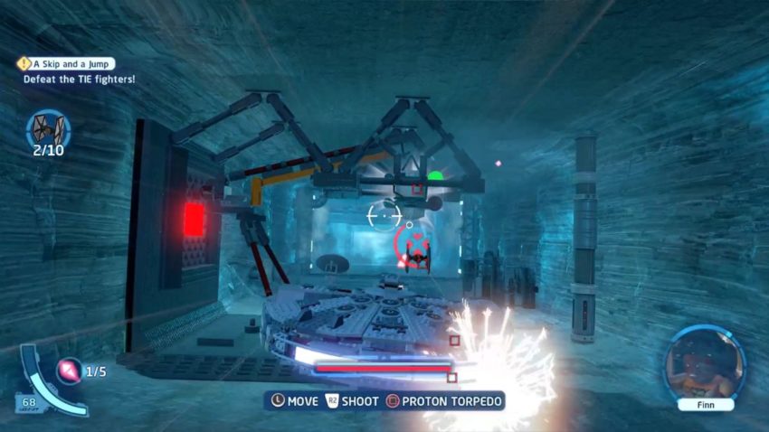 To get all five Minikits in the A Skip and a Jump level in Episode IX – The Rise of Skywalker in Lego Star Wars: The Skywalker Saga, you need to shoot a variety of targets during the first section of the level. As you fly the Millennium Falcon through the ice tunnels of the Sinta Glacier Colony, there are three stationary Minikits located in the tunnels, and two other Minikits held by flying targets.