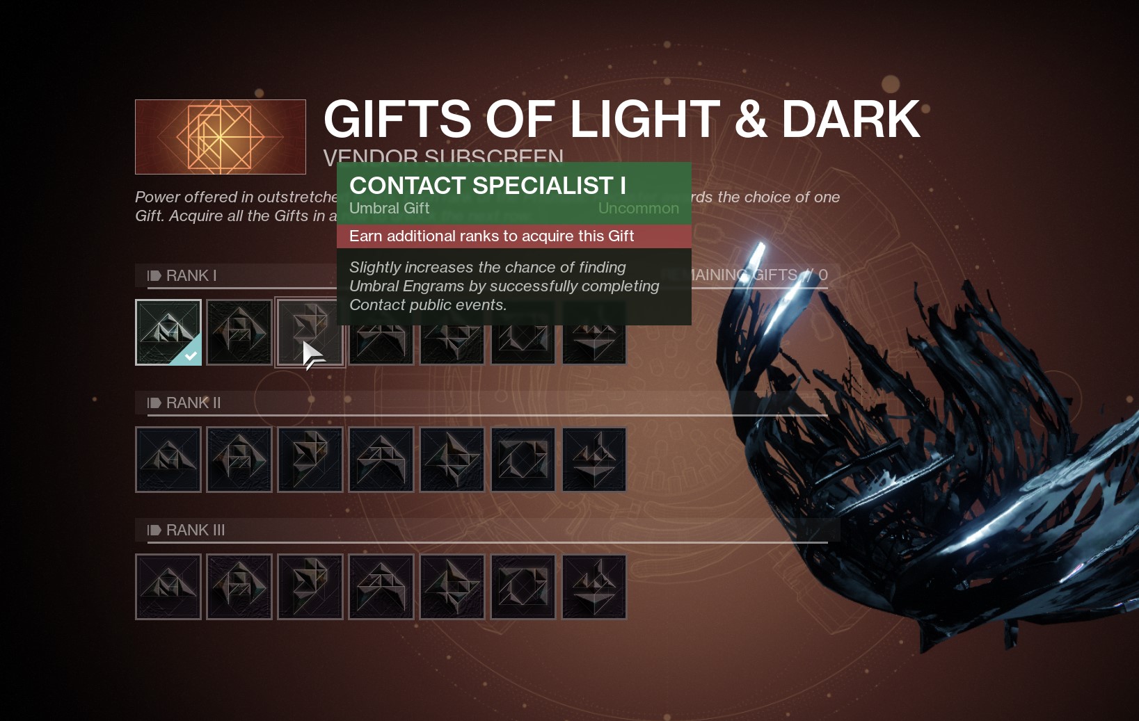 - Contact Specialist I: Slightly increases the chance of finding Umbral Engrams by successfully completing Contact public events