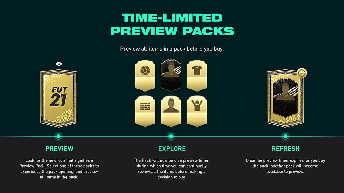 Category: Guides FIFA 21 Platform: PC Platform: PlayStation Platform: Xbox FIFA 21: How do Preview Packs work Ricky Frech Ricky Frech Jun 18, 2021