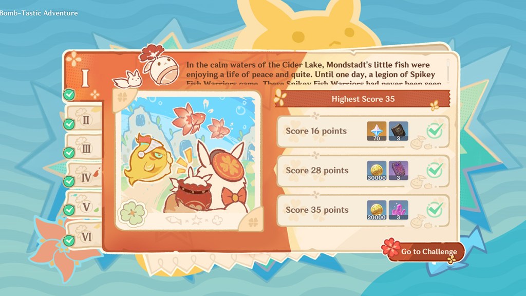 After exchanging greetings, Lisa will take you to the board game she prepared for Klee, the eponymous Dodoco’s BoomTastic Adventure. To get all the rewards, you’ll need to clear the board of enough Spikey Fish to reach specific point thresholds.