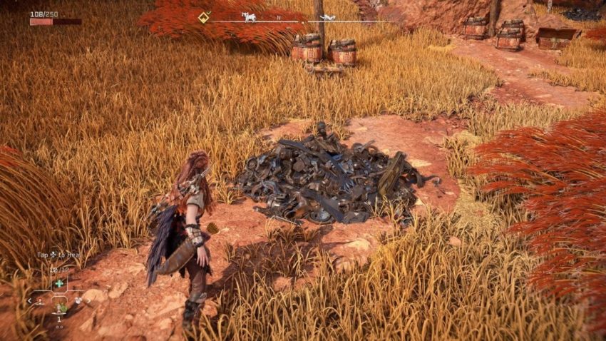 After you’ve collected the leaves and the meat, head to the Scrounger Site by following the road northwest of Chainscrape. The Scrounger Site is just on the other side of the wooden bridge to the northwest. You will know you are in the right area thanks to the piles of scrap. Take out the Scroungers. It is easy to knock off the parts on their backs first before going in for the kill. You can easily kill them if you remain stealthy. After they are defeated, search the scrap piles until you find the part needed for Milduf.