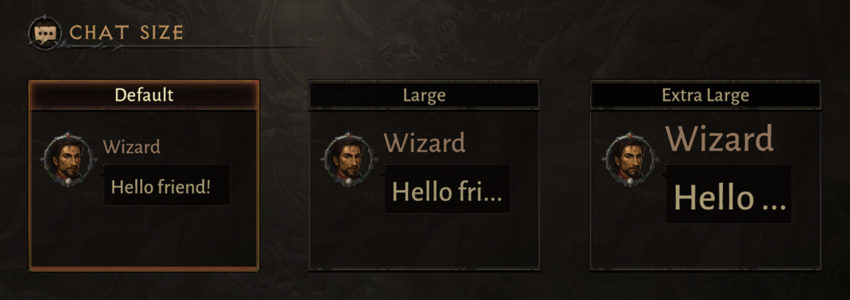 - Resizable Chat Text: Along with the default size of the chat text, you may choose between two larger options, at a 100% and 200% increase in size. These can be adjusted from the Chat tab in the Settings menu.
