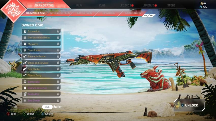 Barnacle Buster is a legendary skin for the R-301 Carbine that gives it an orange theme that matches Ash’s new Denizen of the Deep skin. There are small barnacles along the sides of the gun.