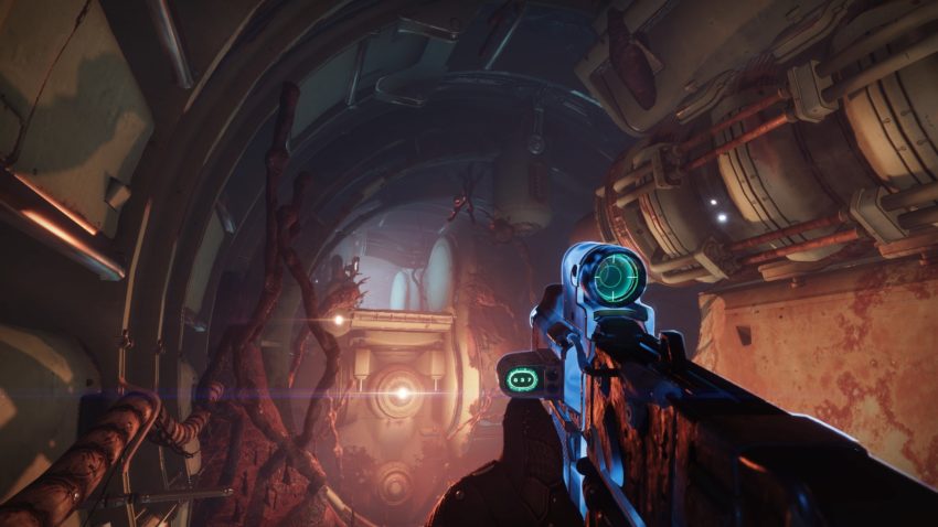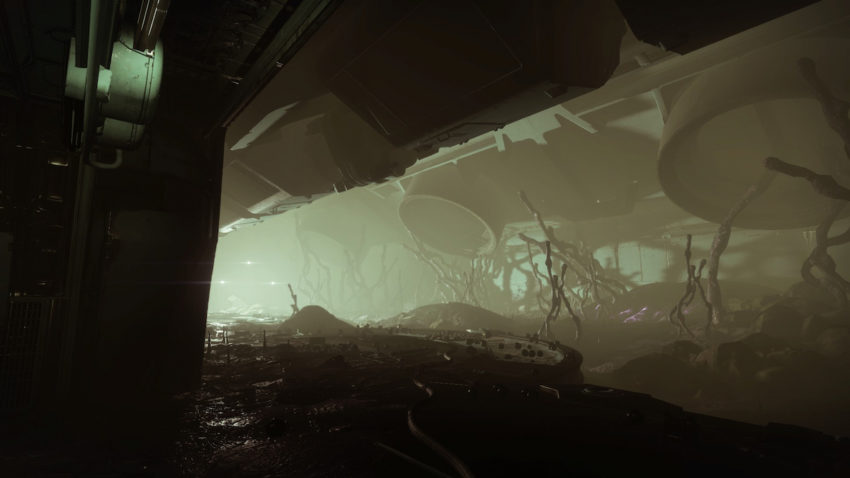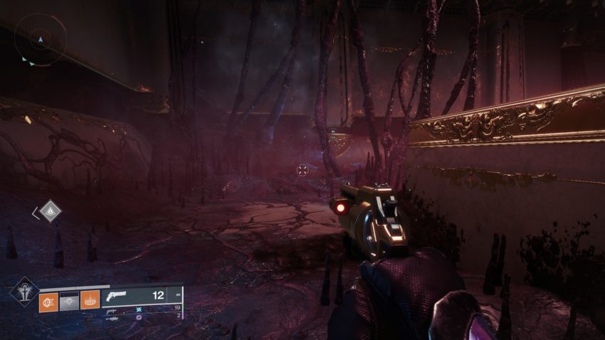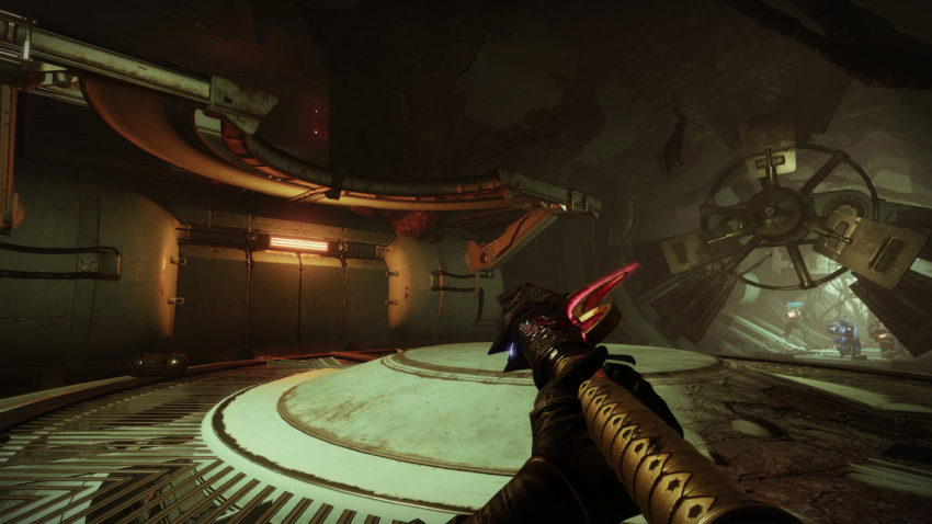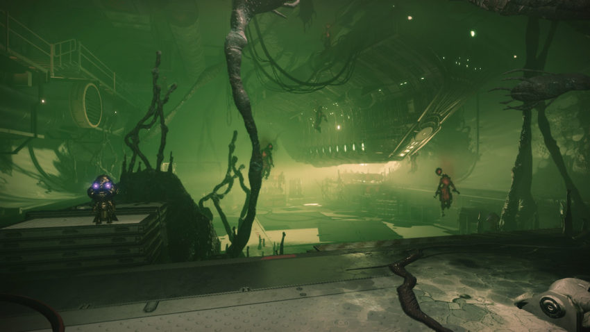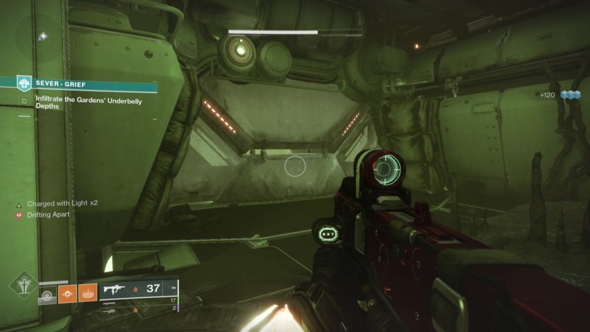 Progress the mission until you are done with the Incineration step, then head back into the hallway with the large fans. A horde of Scorn will appear on a central platform. Clear them, then look up and to your left for a platform above you.
