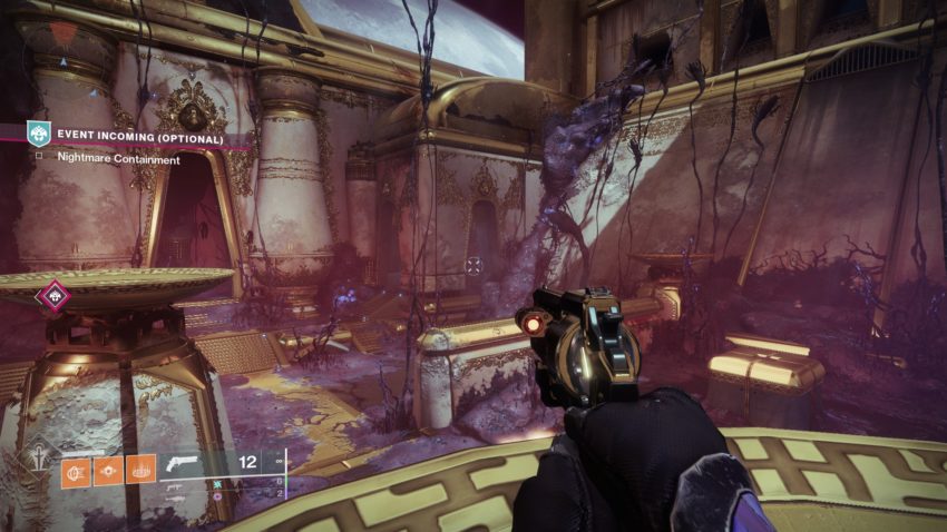 Two switches near five doors activate after you complete Tier 3 of the Nightmare Containment activity. From the Elykris boss area of the Castellum, head to the right of the central pillar and go to the far end of the level. The door you want is to the left of the entrance to the Royal Pools (Sun door) in an alcove.