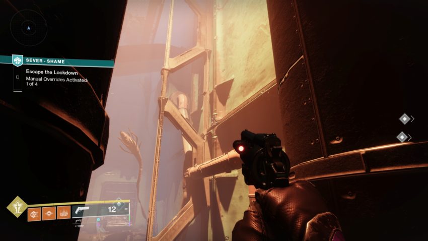 Make your way through the Sever-Shame mission for Crow, and you’ll eventually be chased by an invincible yellow bar Nightmare enemy. In the orange-lit area near where you put the heavy wrench, take the pipes on the right of the space up to the platform above you instead of jumping across to the lever.