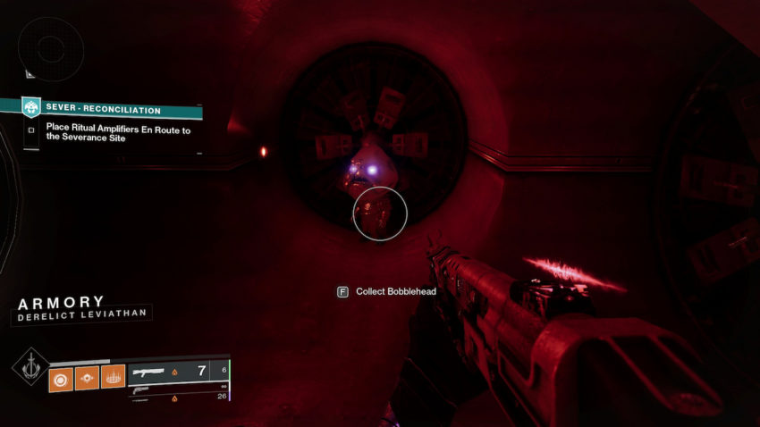 The Bobblehead in Sever – Reconciliation is located early in the mission in the pipes you explore just after placing the first amplifier. Traverse the pipe system until you reach the Egregore door, but do not go through. Instead, go to the very end of the hallway and enter the pipe there.