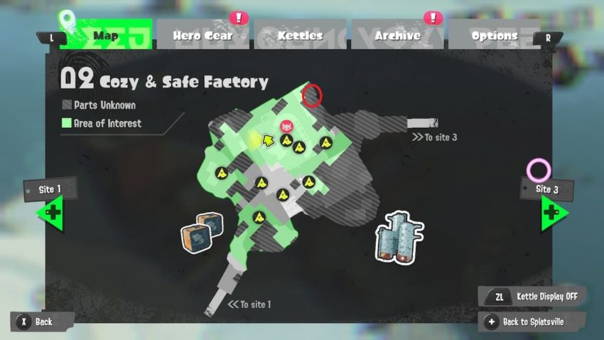 Serving as the second hub level of Splatoon 3’s story mode, Cozy & Safe Factory offers a stiffer challenge than the previous island did. There are only three Sunken Scrolls in this level, with areas spread across vertical platforms. You’ll want to focus on clearing out as much of the Fuzzy Ooze on the island as possible before tackling some of these challenges.