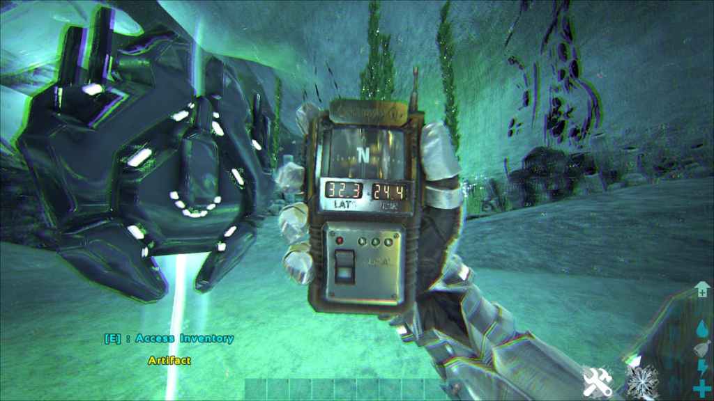 To access this Artifact, you’ll have to find the Bee Cave first. Easily spotted from above in the Redwoods biome, thanks to the bright orange cluster of crystals and the loud buzzing noise, the Bee Cave is located at 31.3, 31.0. You can fly right in, and the Bees here will not attack unless you strike a Beehive or them. There is a pool of water at the back end of the cave at a lower level, and you need to swim down the tunnel. You will require Scuba gear and a good water tame; however, there aren’t that many predators if you approach this angle. The Artifact is at 32.3 and 24.4.