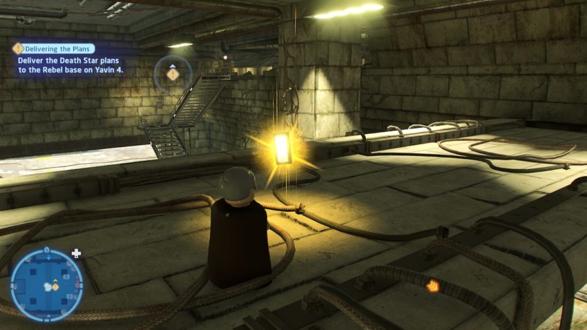 The Datacard in Hoth’s Echo Base location is planted on the ceiling of the base’s main hanger. As shown above, you can use a Hero or Astromech Droid to grapple and climb onto a part of its walls. You’ll then want to continue grappling onto the overhead lights placed in the center of the room until you reach the card.