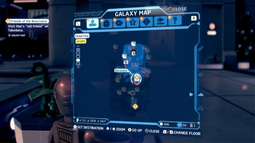 The Mos Eisley Datacard can be found in the top-right corner of its map. It is floating alongside a building’s second story window. So, you can switch to a Jedi or Dark Side character to move and stack nearby boxes until they touch the card. This should allow you to jump to the top of the stack and reach the collectible.
