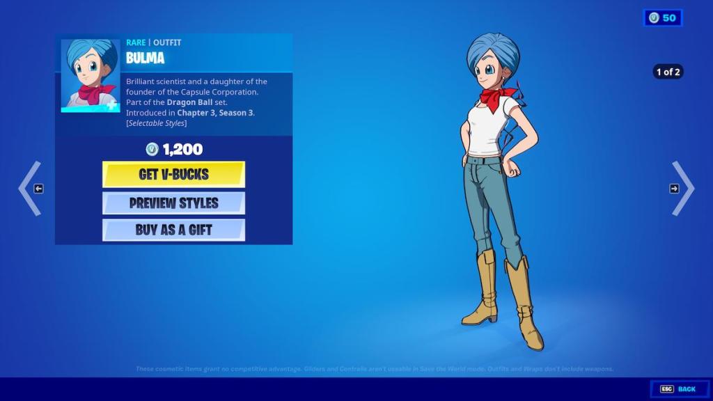 Bulma is a Rare-rarity skin, and that means she is also the cheapest of the bunch. The character comes to Item Shop rotations at the cost of 1,200 V-Bucks, though she is not all players will own when buying the skin. Bulma also comes bundled with a Lab Coat style that can be accessed at any time through the Locker tab.