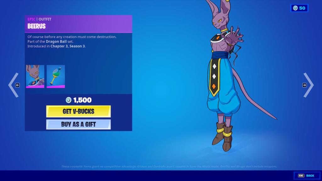 The nonchalant Beerus is Dragon Ball‘s lone Epic-rarity in Fortnite, and features nothing but his usual blue pants and boots. Although the skin does not have an additional style, those who nab Beerus in the Item Shop for 1,500 V-Bucks will also receive The Seer Fish Back Bling, a wine glass that has a small critter poking out from above. Beerus is not guaranteed to be in the Item Shop at any time, rather appearing in rotations at random.