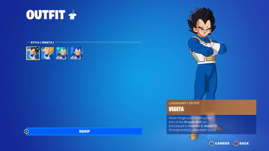 Of course, Fortnite knew you cannot release a Goku skin without also having his famed frenemy Vegeta alongside him. The formerly evil character dazzles his standard blue jumpsuit as well as his white vest and boots. However, players wanting to add a bit of color to Vegeta can alter his hair color with his three own Super Saiyan styles. Additionally, those who unlock him will also own the Charging Up Emote at no additional cost. Vegeta and the Emote can be bought from Item Shop rotations for a total of 2,000 V-Bucks.