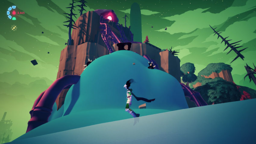 This is found behind the forest altar, the building that takes three switches to open. Circle back there, and mind the vents that will damage you if you stop moving. Skate through to the source and get rid of them, then you’ll be safe to open the cache on a nearby ledge.