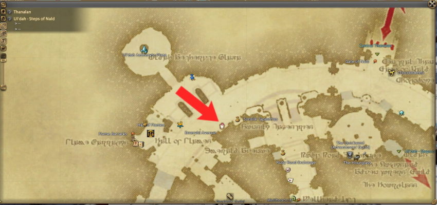 The final Itinerant Moogle vendor is in Ul’dah, Steps of Nald. You will find it close to the entrance before you venture too far into the city. The exact coordinates are at X:9.6, Y:9.1.