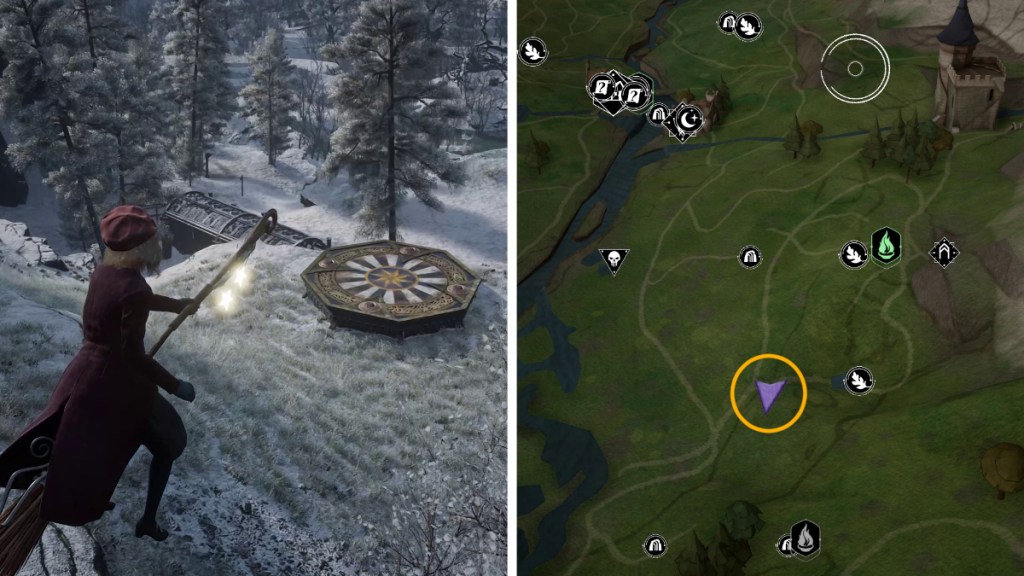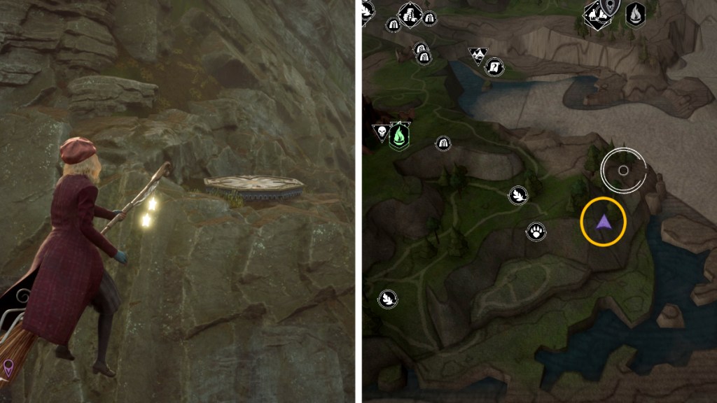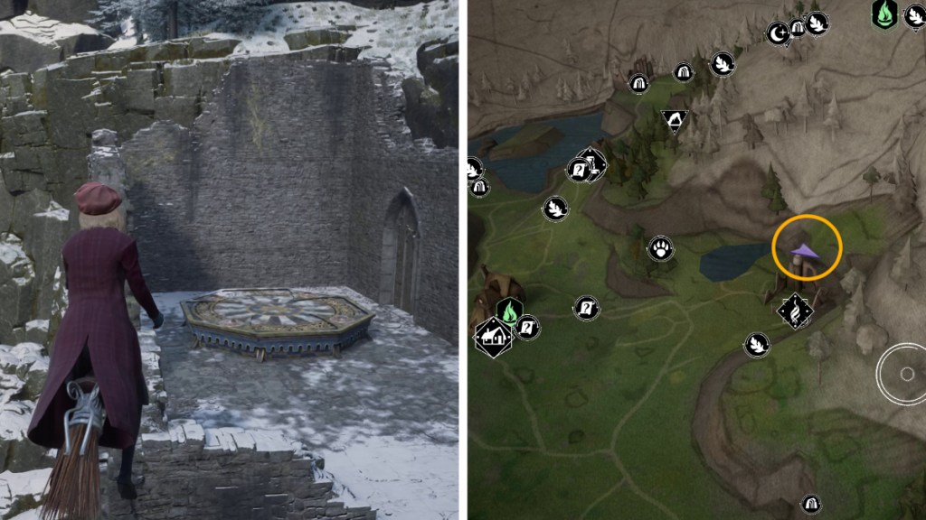 Next, travel to the Floo Flame at Keenbridge on the south side of Hogwarts Valley and fly westward to the ruins on a hill. You will find the Landing Platform on the upper floor of the eastern building in the ruins. For reference, this is also a location where you will find a Merlin Trial, a Treasure Vault, an Ancient Hotspot, and a Diricawl Den.
