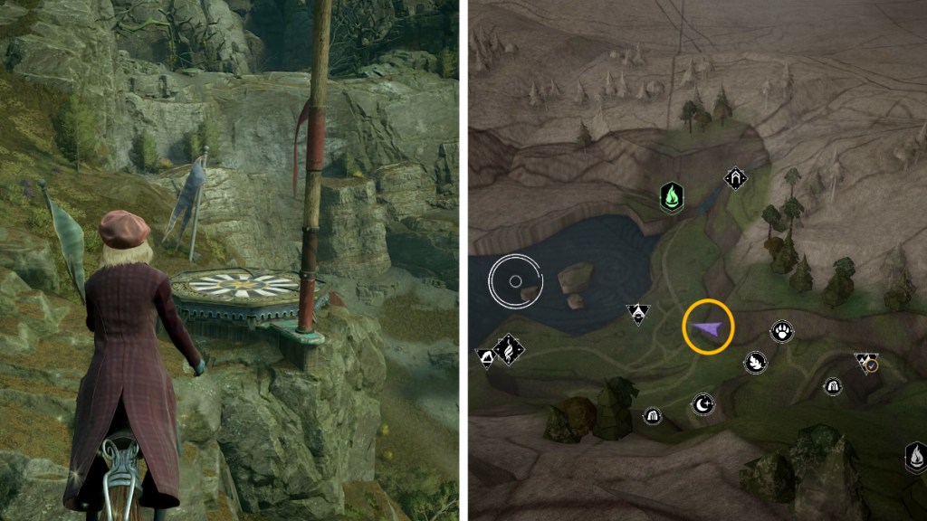 The next two Landing Platform locations in Hogwarts Legacy can be accessed by fast traveling to the East North Hogwarts Region Floo Flame. Southwest of the nearby Bandit Camp, you will discover the platform on a telescope overlook beside a small disheveled shack. For reference, the nearby Bandit Camp is where you locate Rowland’s Map during “The Tale of Rowland Oakes” side quest.