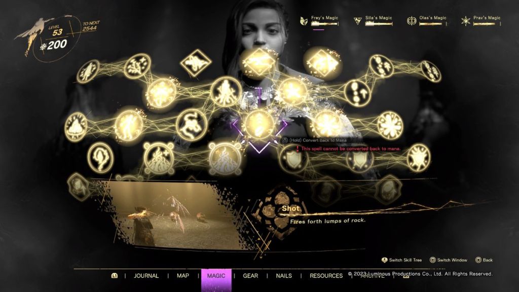 The base attack spell for Prav’s spell tree is called Bolt. This spell allows you to shoot out balls of water that hang around Frey. When you fire a charged shot, the balls of water are expended to deal additional damage. There are three different spells that branch off from the Bolt spell: