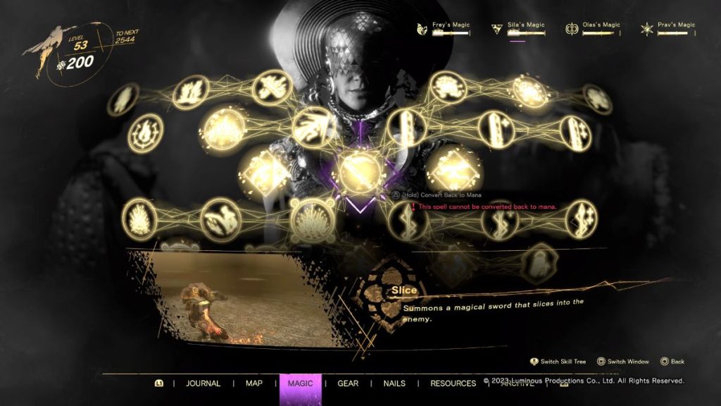 The base attack spell for Sila’s spell tree is called Slice. This spell allows you to summon a short sword that you can use to attack your opponents up close and personal. There are three different spells that branch off from the Slice spell: