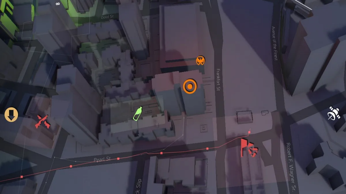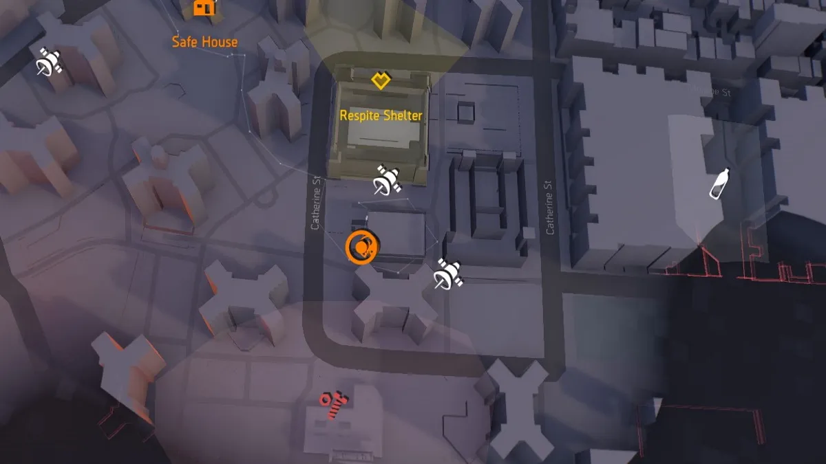 The first location is to the northeast of the safehouse, adjacent to Oliver St. Go to the alleyway in-between the two buildings, and you should find an open maintenance hole. Go up the ladder near the manhole, and then look at the building opposite the SHD cache. You should see a grapple you can shoot down, and then climb up. There’s a vent you can jump and climb across to obtain the first cache.