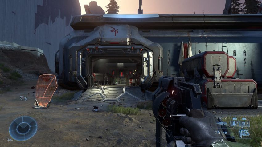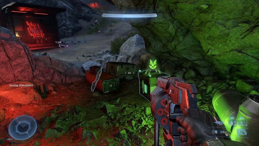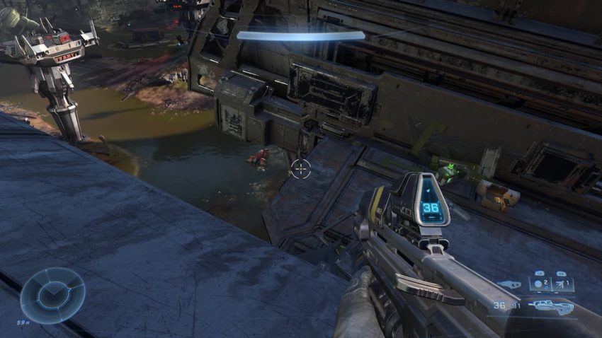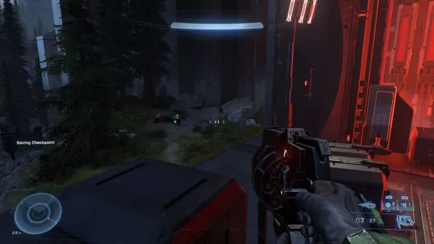 This next spartan core is by the Southwestern end of the area. There’s a bridge in this corner of the map that will be retracted for those collecting the cores early on. If you’re facing the bridge, turn around. You’ll see a looming structure bathed in a red glow. This is an elevator that leads to the top of the structure. Approach the structure and then look to your left rather than taking the elevator. The spartan core is hidden in plain sight to the left side of the elevator control panel.