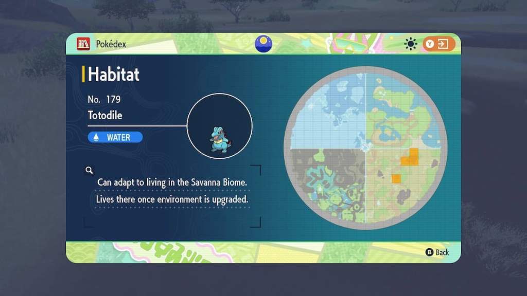 Totodile is another starter Pokemon that you can get by unlocking the Savanna biome upgrade. You must purchase it for 3,000 BP, and the Totodile will start appearing in this region, in the upper part of the southwest area of Blueberry Academy.
