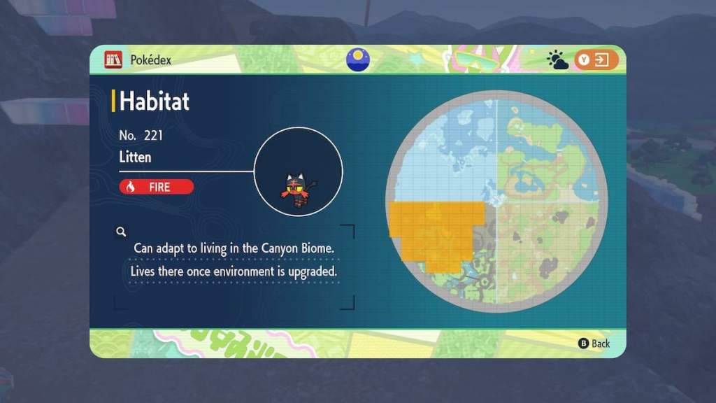 Litten is another returning Starter Pokemon to The Indigo Disk, and you will have a chance to find it in the Canyon biome. You will need to purchase the Canyon Biodiversity boost from the Support Board for Litten to begin spawning at your Blueberry Academy.