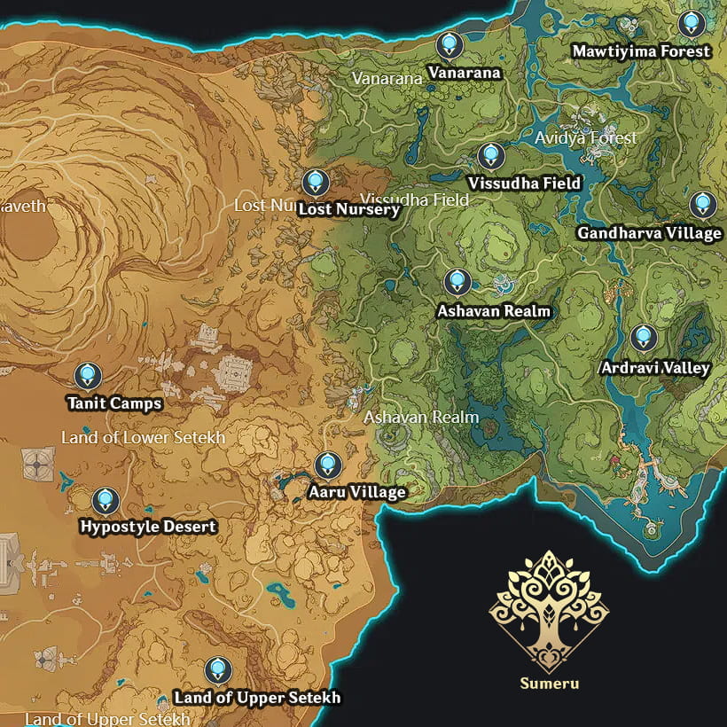 The Sumeru Statues of the Seven can be found at the following locations shown on the map above: