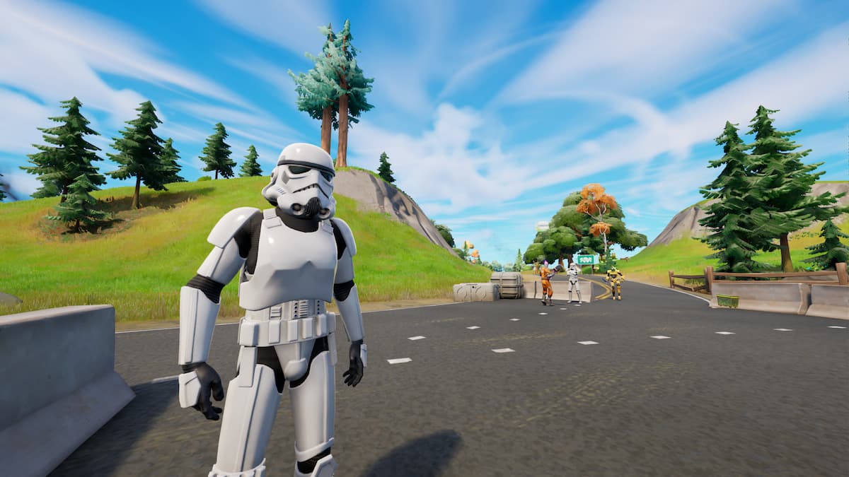 Stormtroopers can only be met at one of three outposts that come in the form of road blocks at certain sections of the map. As shown below, you can find these south of The Joneses, north of Greasy Grove, or in between Shifty Shafts and Sleepy Sound. Like any other NPC, you are able to speak with them and see what services they offer. For one, the limited-time Mythic E-11 Blaster Rifle can be bought from them for 100 Gold.