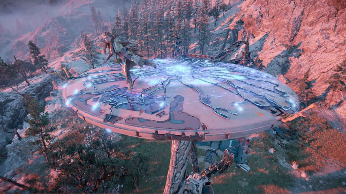 This Tallneck is circling an abandoned settlement in trees. On the ground are some Stalkers with Clamberjaws occupying the tree levels. If you have not unlocked Sunwing mounts yet, you will need to glide into the village from the nearby mountain and climb to a point where you can jump onto the head.