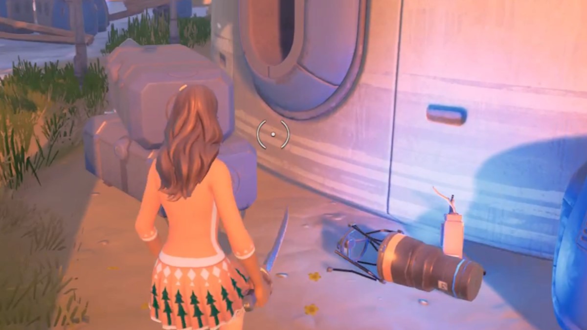 The telescopes are generally lying on the ground next to the walls of buildings, and aren’t that easy to spot. Look out for a little white square with an exclamation mark (!) in it on your mini-map. That marks the location of a nearby telescope. The telescopes all glow blue and can be destroyed with a single strike from your Harvesting Tool. You don’t automatically collect the parts, so make sure you interact with the telescope after breaking it.