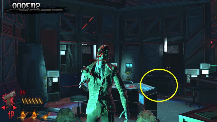 After encountering the locked door, you will enter a room to find the key card necessary to proceed. You will head into a room where three zombies will attack – one will be active at first, and the other two will get up later. The weapon box is on the right side of the room, at the back next to the computer monitors.
