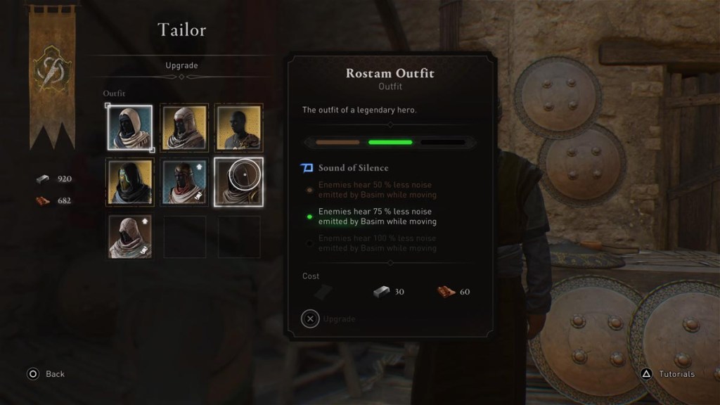 The upgrade schematics for the Rostam Outfit are also only received through contacts. For these, you’ll need to complete The Traitor and Orion’s Belt contract. Both of these come much later on in the story. I first got The Traitor mission after fulfilling the tasks of The Perfume Traior contract. The first upgrade for the Rostam Outfit enables 75% less noise emitted by Basim while moving, and the final upgrade brings this to 100%.