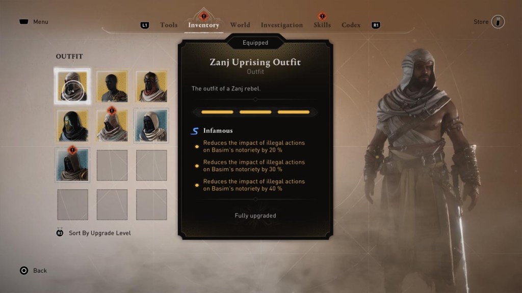 Unless you’re looking to go on a rampage and steal everything in sight, I just don’t see the benefit to the Zanj Uprising Outfit. It gives you a maximum of 40% less impact of illegal actions on your notoriety, but that still doesn’t seem like a lot. Considering it’s extremely easy to remove your wanted posters, and it’s barely a hassle to do so, there are a lot better Outfits you can consider investing in.