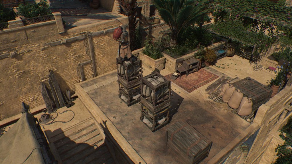 The house itself is on the west side of the Round City, close to the center of the Green Dome building, and you can use your eagle vision to pinpoint the exact location of the Gear Chest. Once here you’ll want to navigate to the roof of the building where you will discover a breakable roof section. Drop down one level to the north side and you will see some flammable vases. Pick up one vase and keep heading north toward the two stacks of moveable platforms.