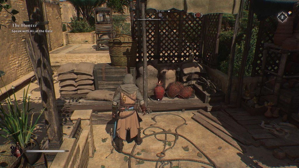 Once you have reached the west building, turn to the left and you’ll see a rope that is attached to the roof of Al-Jahiz’s House. With the vase cross this rope and you will be at the breakable section again. You’ll want to either place the vase next to this section and throw a dagger at the vase to trigger an explosion, or just throw the vase at the breakable section of the roof. Be careful not to get too close, or you might hurt yourself and be set on fire.