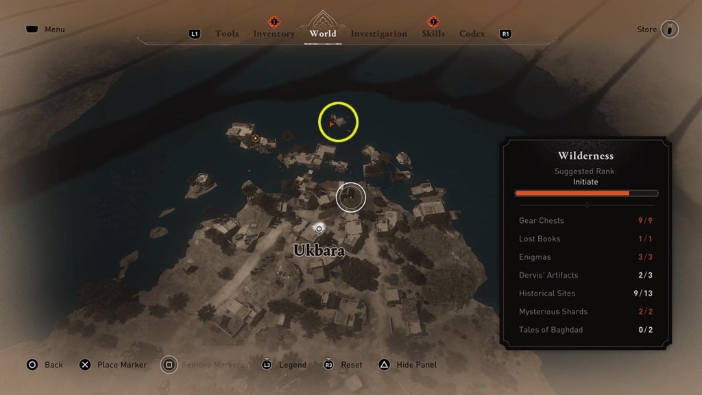 The Surrender Enigma in Assassin’s Creed Mirage has a few keywords you want to use as landmarks to get your bearings. This riddle talks about ‘what’s left of my life north of the oasis in the village of my birth‘. The first one to kick things off is your starting location, which is an ‘oasis’. A large standout oasis in the Wilderness region is located on the map’s northern side.