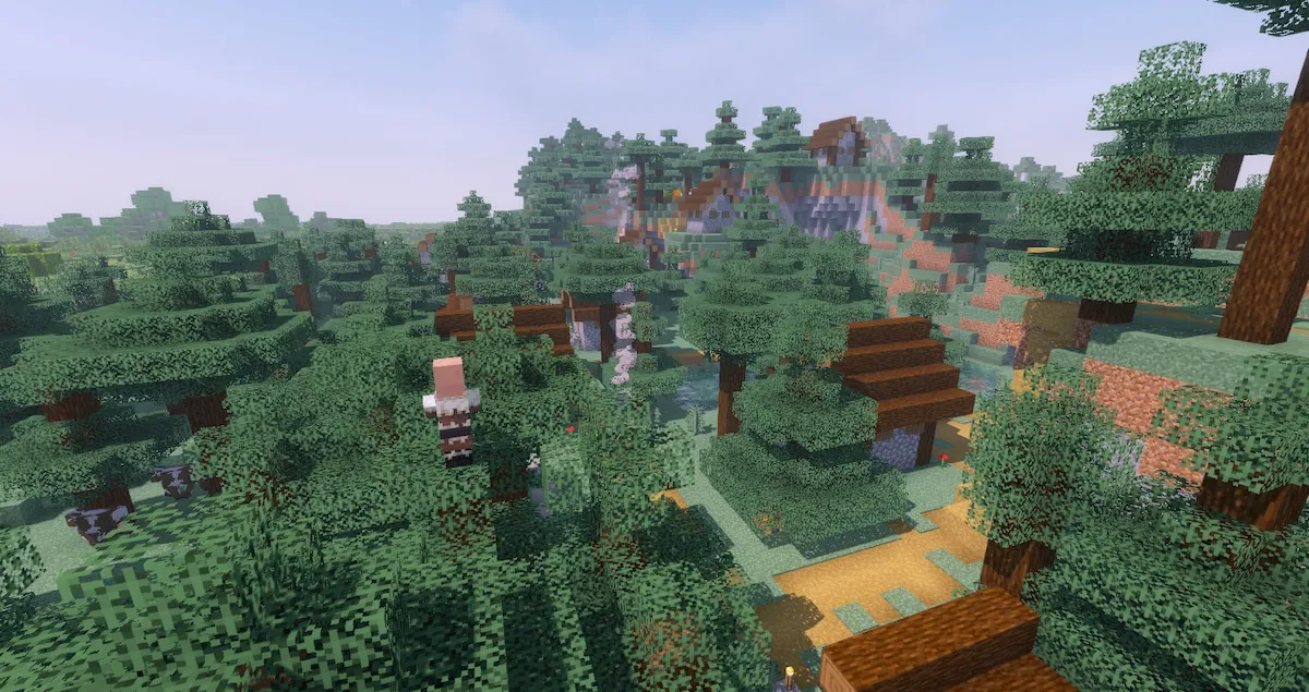 This seed doesn’t spawn you in the Taiga biome, but it isn’t too far away. The biome is 1000 blocks from the spawn, and you can get there by crossing an ocean and a forest. The biome is right next to a large birch forest and has a small village in the center of it.