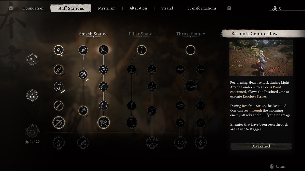 Resolute Counterflow is by far the best early-game skill in Black Myth Wukong in the Smash Stance. As you land a series of light attack combos with this skill unlocked, you can consume a Focus Point and unleash the Resolute Strike.