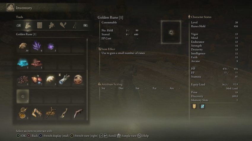 These Golden Runes come in different sizes, indicated by the number in brackets, with larger numbers granting greater quantities of runes. Rather than memorizing the quantity each size will grant you, we would recommend traveling to a vendor and selling them. This will allow you to check the price of each Golden Rune, and you will receive the same number of runes either way. If you’re a few runes short at any point, you may want to keep an eye out for the glowing skulls that are sometimes lying on the ground, as hitting those with a weapon or running them over on Torrent will drop a Golden Rune [1].
