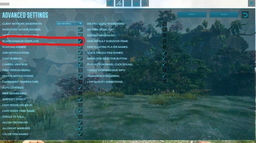 Turning off the blood through settings in Ark