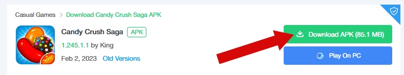- Candy Crush Saga APK file (size: 85 MB, version 1.245.1.1)