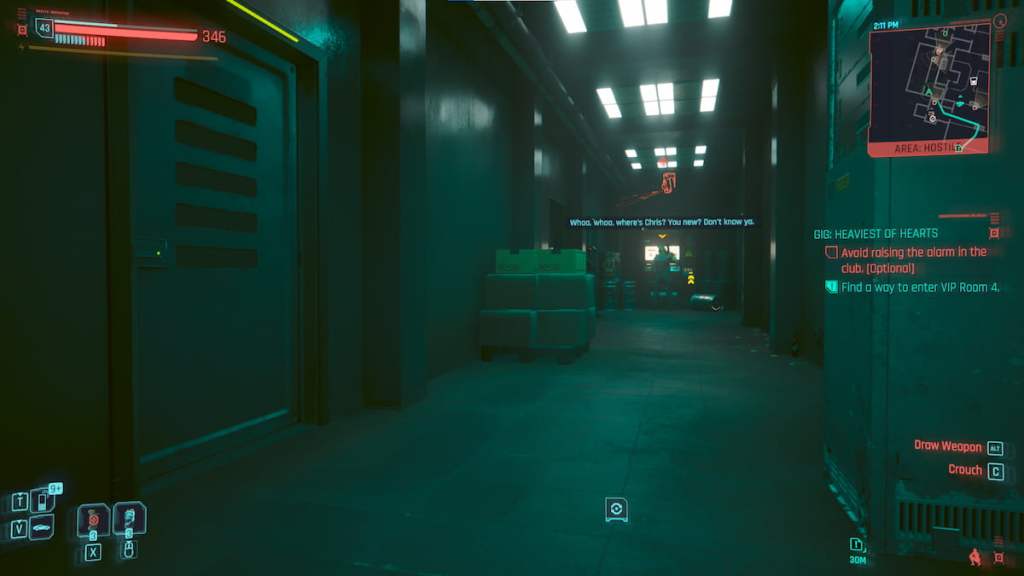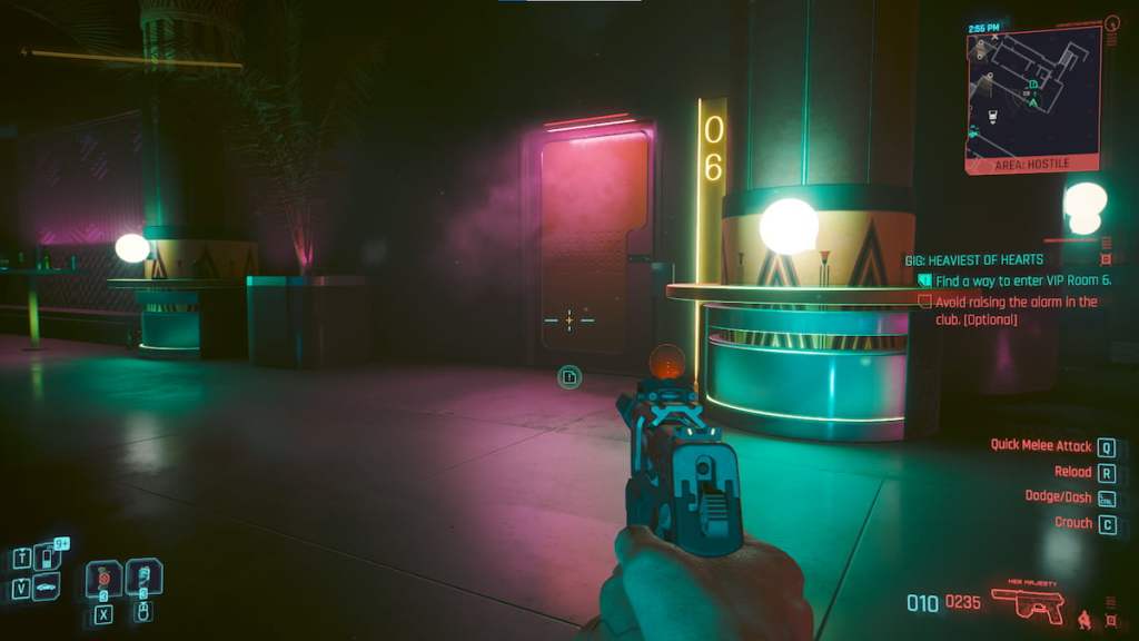 When you’re in this side area with the lone guard, activate the lights to distract and take them out. There will be another guard a short distance away you should be able to quickly knock out before making your way down the rest of the hallway. When your Cyberpunk 2077 character reaches the end, take a right, and VIP Room 6 will be on the right side, and you’ll have reached it without activating the alarms.