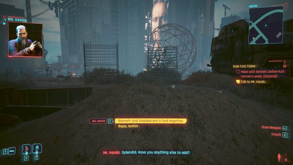 Should You Tell Mr. Hands About Bennett & Arasaka in Cyberpunk 2077 Run This Town?