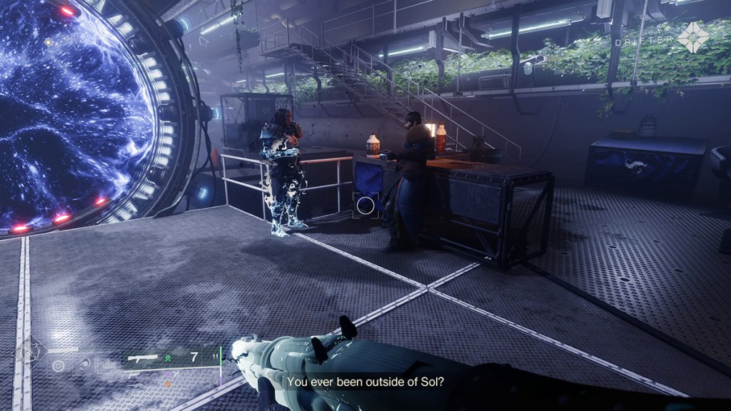 Immediately after speaking with Sloane, Zavala, and the Drifter, enter the blue portal at the back of the room to reach a new wing of the H.E.L.M. The holoprojector to the left of the portal there will give you a message from Drifter.