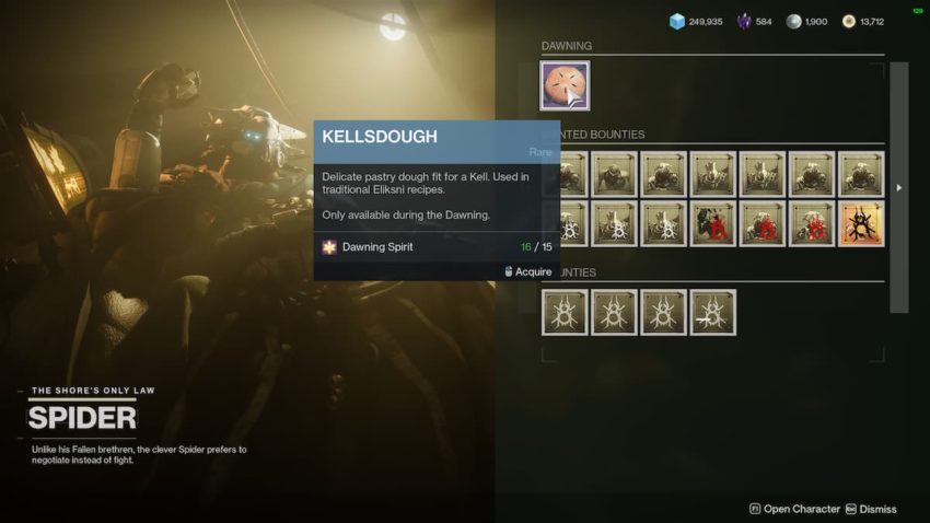 Step 3 – Collect enough Dawning Spirit to purchase Kellsdough from Spider.