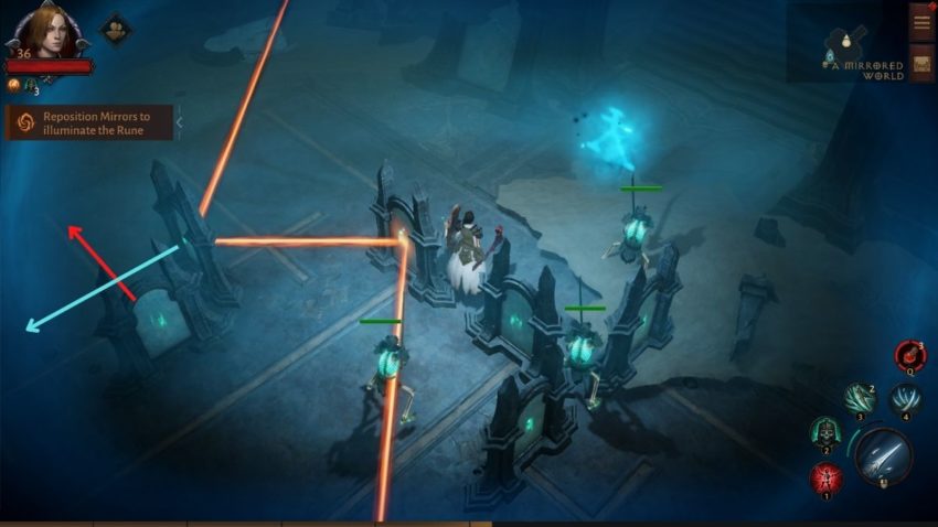 When the puzzle begins, you will see a beam of light shoot across the room and hit some of the mirrors. It will bounce off the mirrors in the pattern you see in the image above. You will need to move the mirrors along the track to make the beam of light hit the rune at the end of the room. Start by moving the two mirrors following the arrows. Move the mirror next to the one with the light hitting it backward. Afterward, move the mirror with the light hitting it down the track in the direction of the blue arrow.