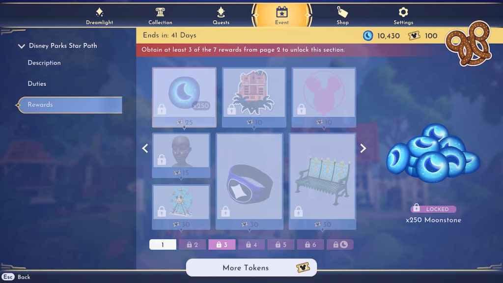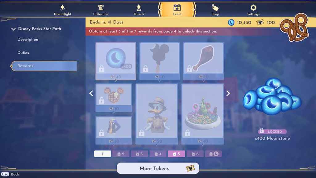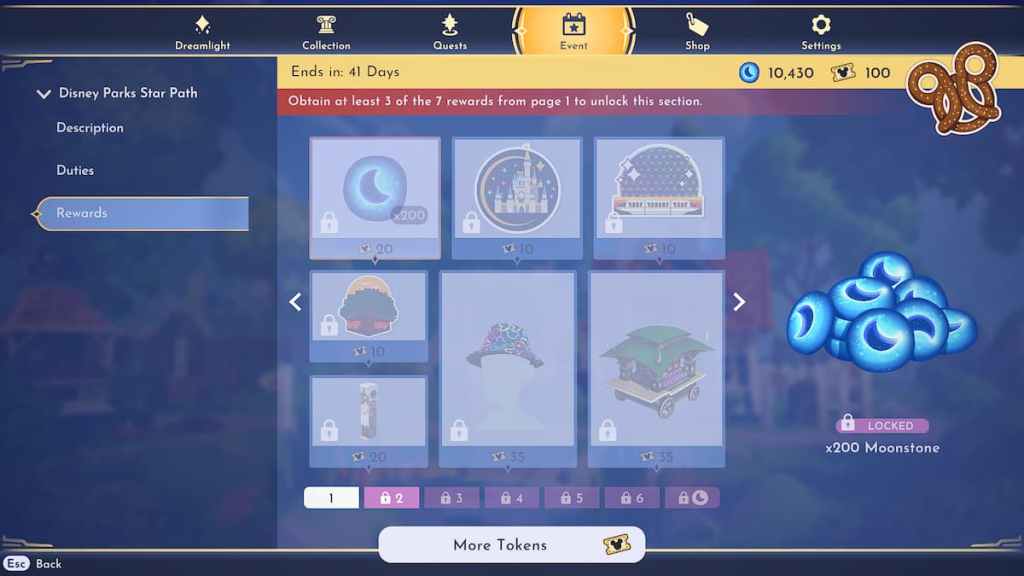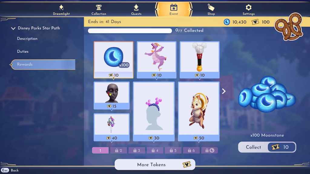 The Disney Parks Star Path challenges players to complete event-specific duties similar to the regular Dreamlight Duties you’re already familiar with. These duties require you to complete tasks like speaking with a specific companion or serving them meals at Chez Remy. A total of three duties are available to complete at a time (six if you purchase the Premium Star Path), and a new duty will become available once one is completed. You will need to earn 1000 tokens to buy all rewards in the Premium Star Path, excluding the Moonstone rewards in Tier 7.